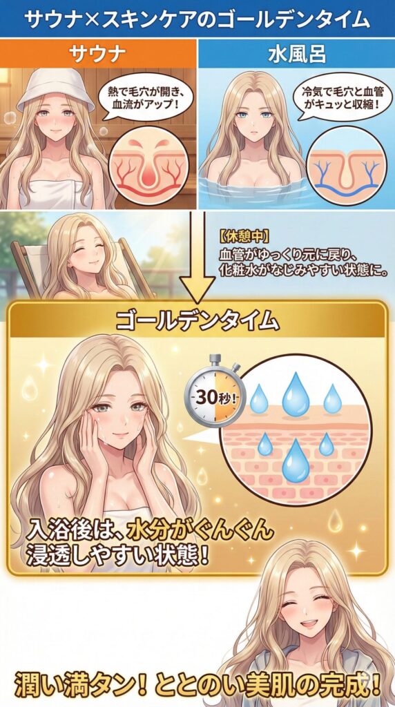 素早く適切なスキンケアを行えば、サウナ自体には「毛細血管が発達して肌に栄養が届きやすくなる」という効果があるため、結果として美肌につながるとされています。