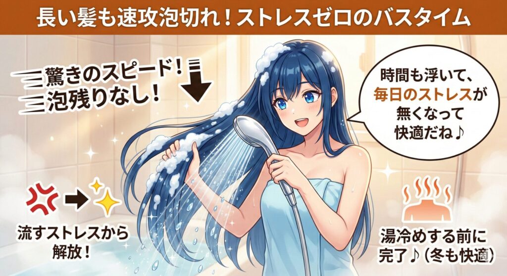 髪の長い女性や、子供の体を洗うママにとって、「泡やリンスを流し切るのに時間がかかる」というストレスから解放されるのは大きな救い。